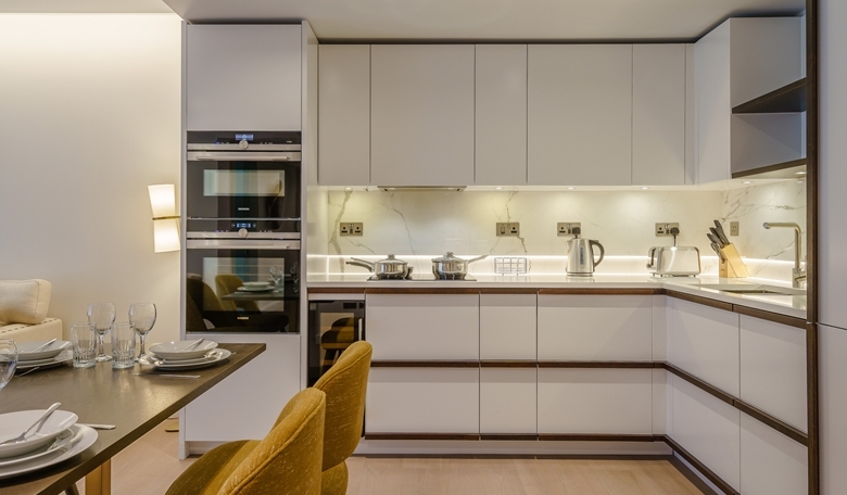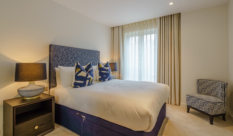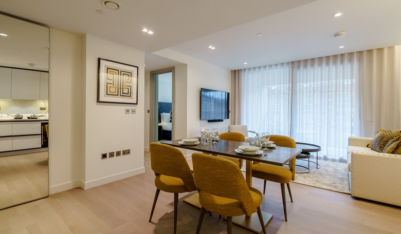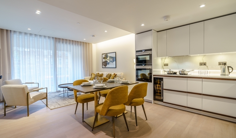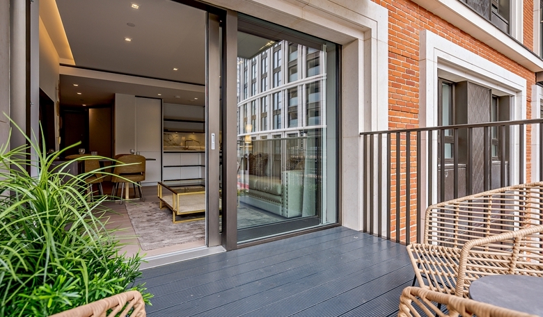 A luxurious interior designed one-bedroom 1st floor apartment set over 549 SqFt comprising a large open-plan reception room leading onto a private inset balcony. The fully integrated kitchen with appliances from Siemens and Miele including oven and induction hobs, large fridge freezer and dishwasher and wine chiller all inset into a composite stone work tops. The apartment has one double bedroom and one bathrooms. The whole apartment also benefits from comfort cooling.