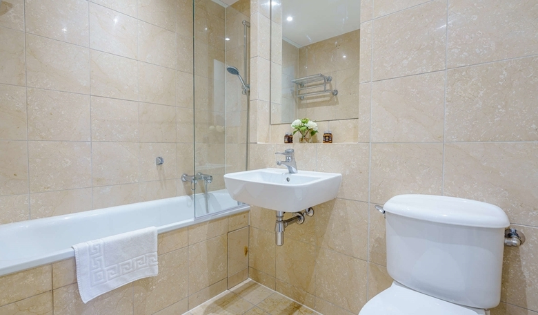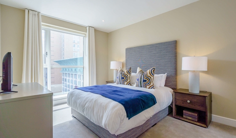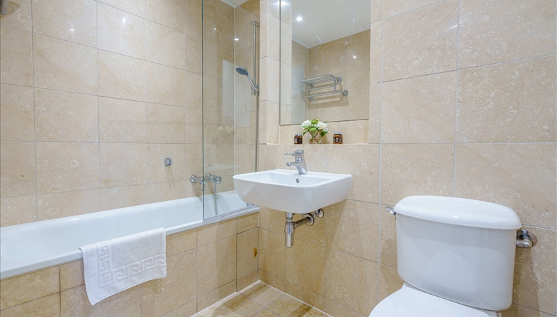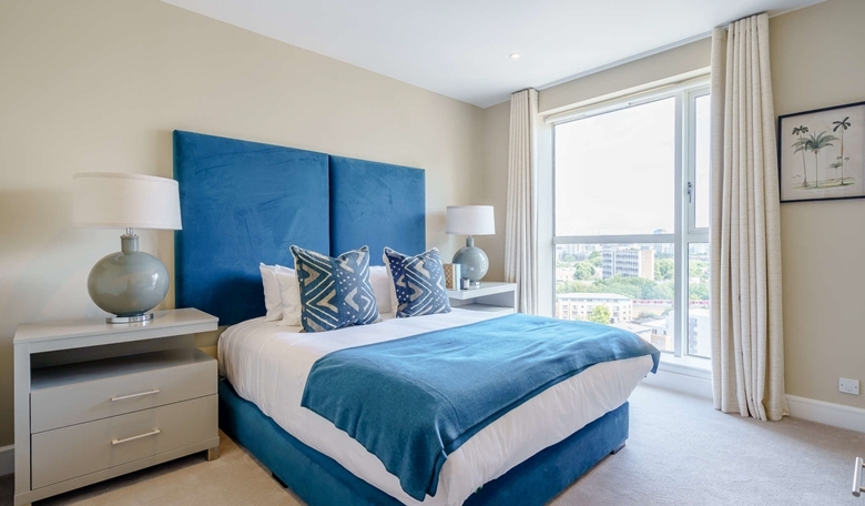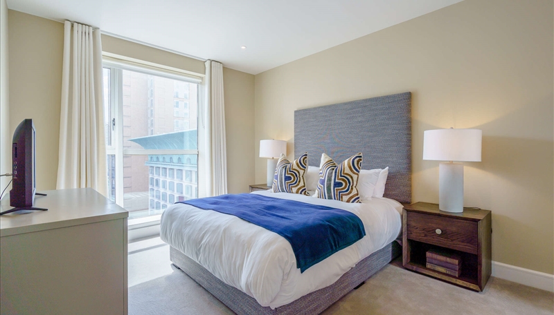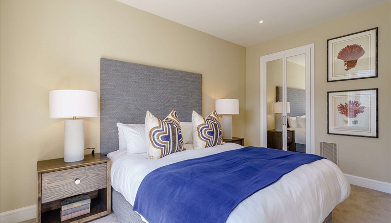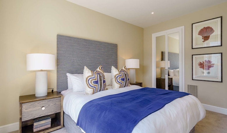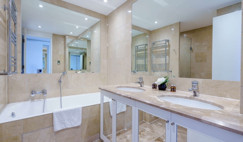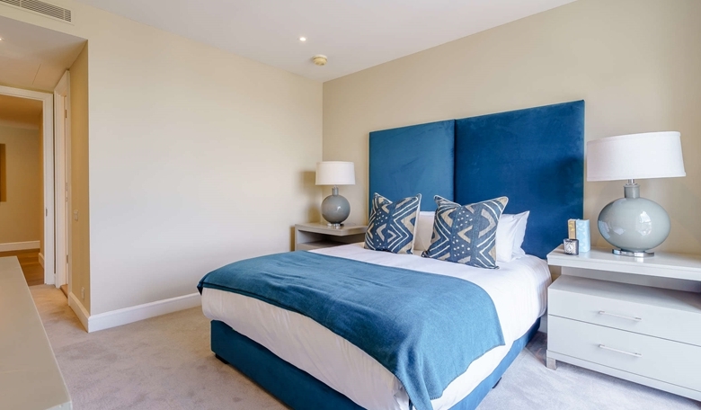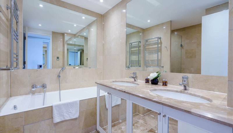 The primary bedroom includes a marble-finished en-suite bathroom, while the second bedroom and family bathroom are equally luxurious. Both bedrooms are furnished with king-size beds, bespoke mirrored wardrobes, and plush carpeting for added comfort.