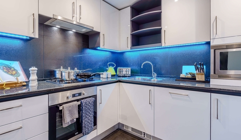 The fully equipped kitchen features stylish LED mood lighting, a full-sized fridge/freezer, electric oven with gas hob, microwave, dishwasher, washer/dryer, and food waste disposal, everything designed for effortless living.